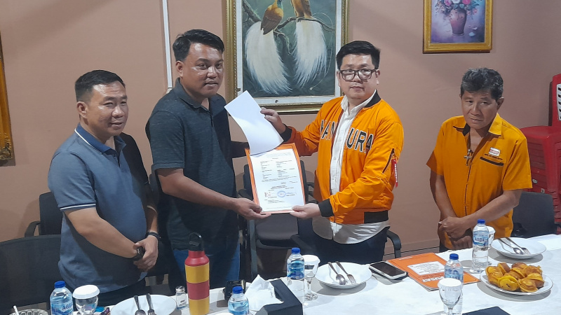 Ketua DPD Partai Hanura Sulut, Reynold Wuisan, menyerahkan secara langsung SK dukungan partainya ke pasangan Geraldi Mantiri-Erwin Wurangian.