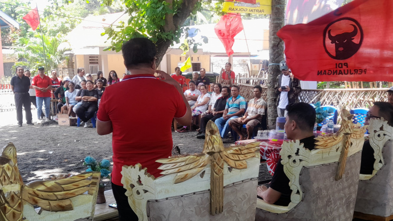 Maurits Mantiri selaku Ketua DPC PDI Perjuangan Bitung berorasi dalam kampanye paslon Geraldi Mantiri-Erwin Wurangian di Batuputih Atas.