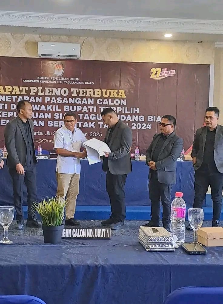 Sitaro, megamanado-Komisi Pemilihan Umum (KPU) Kabupaten Kepulauan Siau Tagulandang Biaro (Sitaro) menggelar Rapat Pleno Terbuka Penetapan Pasangan Calon Terpilih dalam Pemilihan Bupati dan Wakil Bupati Sitaro Tahun 2024, Kamis (9/1/2025) di Hotel Jakarta Ulu Siau.