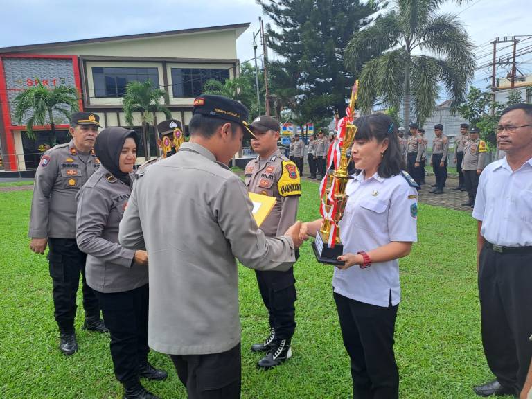 Veronique Kumentas menerima tropi pemenang Lomba Satkamling 2023 dari Kapolres Bitung.(ist)
