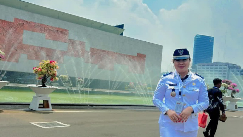 Marlin Lengkong ketika berfoto di kompleks Parlemen Senayan, Jakarta. Marlin hadir di sana karena diundang atas keberhasilannya membawa Kelurahan Tanjung Merah jadi juara Lomba Kelurahan se-Sulut.(ist)